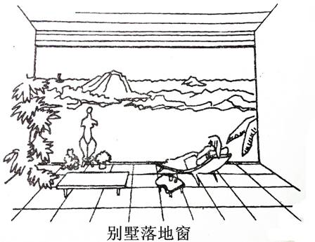根据房间面积的大小和采光面积比,即可求得房间的采光面积,如一个12平方米的起居室,采光面积比为1/6,那么该室的采光面积应为2平方米。但是采光面积并不就是窗口的面积,因为窗的形式和窗料对采光有阻挡的影响(如图下),所以由采光系数算出的采光面积百分比才能最后得出窗口的实际面积。如上例中我们选用采光面积百分比为77%的钢窗,所得到的窗口面积则是2/77%=2.6平方米。实际的窗口面积总是大于采光面积。考虑到玻璃的污染情况或南方通风要求高的情况,窗口面积还要加大少许。而对于那些面对良好景观的别墅住宅,大面积的开窗对景观纳入的需求业已大大超过了对采光的需求(如下图)。
